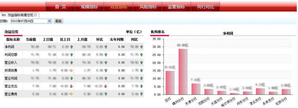 領(lǐng)導(dǎo)駕駛艙是對(duì)于管理者開放的模塊,包括管理者日常工作中最關(guān)注的指標(biāo),并且通過直觀的圖形的方式展示,便于管理者快速了解銀行的經(jīng)營狀況以及進(jìn)行風(fēng)險(xiǎn)的預(yù)警。