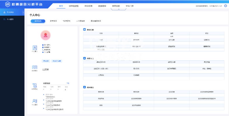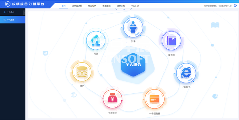 個(gè)人服務(wù)以多維度來(lái)分析和展現(xiàn)個(gè)人的各項(xiàng)工作和生活數(shù)據(jù),包括教學(xué)、圖書(shū)館、上網(wǎng)服務(wù)、一卡通消費(fèi)、工資績(jī)效、資產(chǎn)和科研等模塊,通過(guò)下鉆可以查看對(duì)應(yīng)模塊的詳細(xì)情況。如下圖: