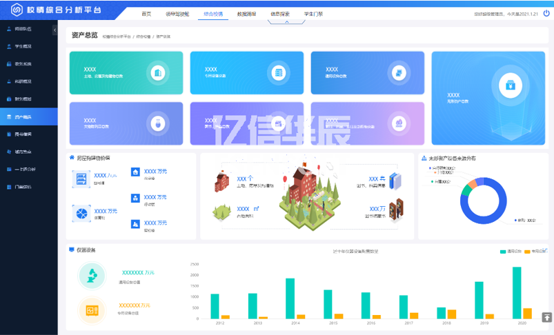 強(qiáng)化資產(chǎn)管理是推進(jìn)預(yù)算制度改革的重要內(nèi)容,也是部門預(yù)算有效執(zhí)行的重要保證。資產(chǎn)概括頁(yè)面通過(guò)分析學(xué)校各類型資產(chǎn)的存量和分布情況,可以提高資產(chǎn)的利用率,從而指導(dǎo)探索進(jìn)一步管好用好高校資產(chǎn)的方法與途徑。如下圖: