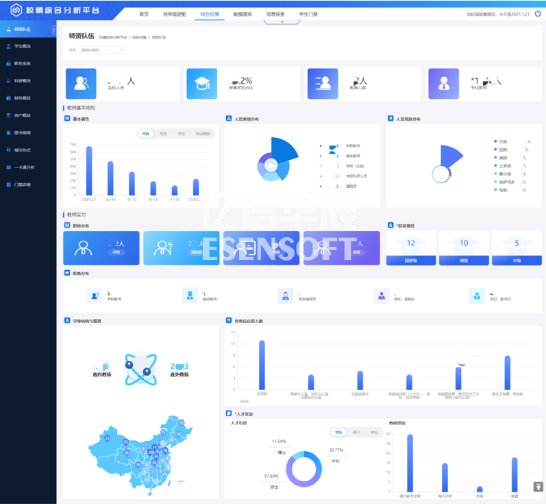 高校師資隊(duì)伍建設(shè)的優(yōu)劣決定了高校人才培養(yǎng)質(zhì)量的高低。如何在大數(shù)據(jù)時(shí)代科學(xué)利用源于高校各個(gè)層面的海量數(shù)據(jù),并使之成為高校師資隊(duì)伍建設(shè)的參考與方向,是眾多高校需要解決的問(wèn)題。師資隊(duì)伍頁(yè)面通過(guò)展現(xiàn)教職工主要的屬性指標(biāo),分析了目前高校師資隊(duì)伍建設(shè)中所存在的問(wèn)題,對(duì)加強(qiáng)高校師資隊(duì)伍建設(shè)起到指導(dǎo)作用。如下圖: