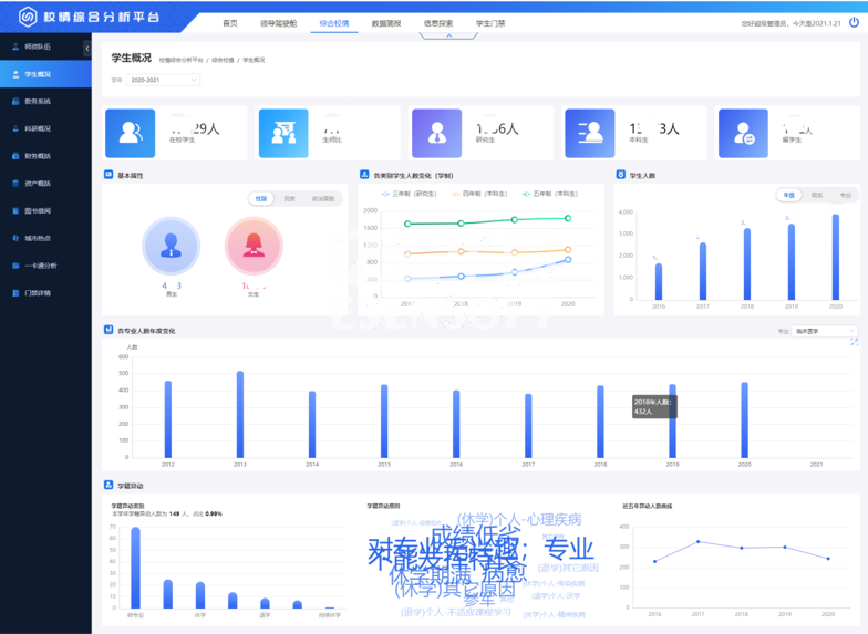 陜西中醫(yī)藥大學(xué)數(shù)據(jù)分析平臺(tái)項(xiàng)目建設(shè)是將陜西中醫(yī)藥大學(xué)數(shù)據(jù)以各種圖表等形式在平臺(tái)上展示,可直觀地掌握學(xué)校信息的情況,通過(guò)統(tǒng)計(jì)不同維度來(lái)分析不同的問(wèn)題。平臺(tái)為信息資源整合共享奠定基礎(chǔ),為學(xué)院教學(xué)、科研、管理和服務(wù)提供統(tǒng)一、規(guī)范、準(zhǔn)確、實(shí)時(shí)的權(quán)威數(shù)據(jù)服務(wù),并為今后的數(shù)據(jù)挖掘和科學(xué)決策提供可靠的依據(jù)。