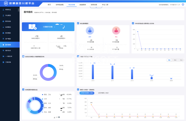 學(xué)生概括展現(xiàn)出學(xué)生的基本屬性、人數(shù)分布、學(xué)籍情況、借閱與消費(fèi)、畢業(yè)與就業(yè)等指標(biāo)。如下圖:
