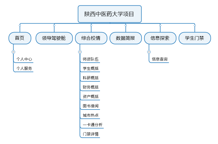 陜西中醫(yī)藥大學(xué)數(shù)據(jù)分析平臺(tái)項(xiàng)目,涉及內(nèi)容包括首頁(yè)、領(lǐng)導(dǎo)駕駛艙、綜合校情、數(shù)據(jù)簡(jiǎn)報(bào)、信息探索和學(xué)生門禁等各項(xiàng)內(nèi)容。平臺(tái)項(xiàng)目功能架構(gòu)圖如下: