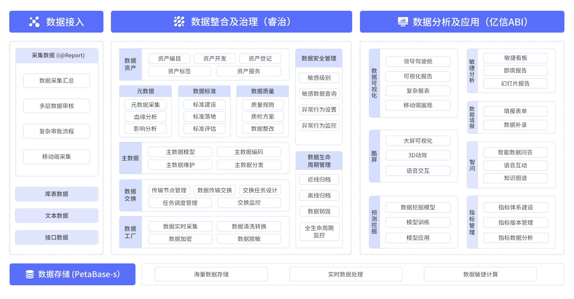 也正是憑借大數(shù)據(jù)領(lǐng)域的經(jīng)驗(yàn)沉淀,億信華辰積極布局?jǐn)?shù)據(jù)治理領(lǐng)域,百余次產(chǎn)品迭代,打磨出睿治智能數(shù)據(jù)治理平臺(tái)并榮獲DAMA中國數(shù)據(jù)治理優(yōu)秀產(chǎn)品獎(jiǎng),形成包含元數(shù)據(jù)管理、數(shù)據(jù)標(biāo)準(zhǔn)管理、數(shù)據(jù)質(zhì)量管理、主數(shù)據(jù)管理、數(shù)據(jù)集成管理、數(shù)據(jù)交換管理、實(shí)時(shí)大數(shù)據(jù)管理、數(shù)據(jù)資產(chǎn)管理、數(shù)據(jù)安全管理、數(shù)據(jù)生命周期管理等十大功能模塊的數(shù)據(jù)治理產(chǎn)品方案,可自由組合快速滿足政企用戶數(shù)據(jù)治理全場景應(yīng)用,助力數(shù)據(jù)標(biāo)準(zhǔn)落地,提升數(shù)據(jù)質(zhì)量,實(shí)現(xiàn)數(shù)據(jù)資產(chǎn)化。