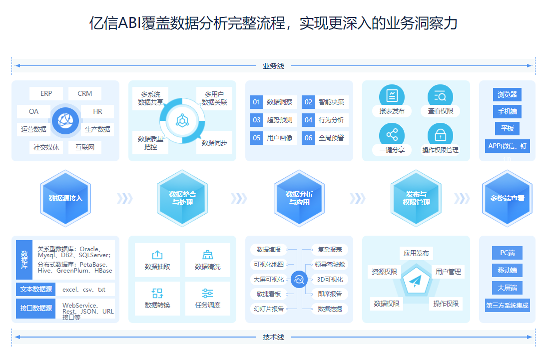 作為一款全能型數據分析工具,億信ABI不僅支持連接類似oracle、mysql之類的數據庫,還支持類似文件數據或者網絡接口數據,數據來源支持廣泛;億信ABI的分析方式也很豐富,可以滿足市場上的各種場景需求,不論是中國式復雜報表,還是類似天貓雙十一作戰(zhàn)大屏的交互式炫酷效果,它都能實現(xiàn);億信ABI系統(tǒng)的擴展性和穩(wěn)定性都很OK,對于大數據量的數據分析,實現(xiàn)系統(tǒng)的線性擴展的同時保證良好的系統(tǒng)穩(wěn)定性;大數據時代,對數據處理的能力要求也變的更高,億信ABI就實現(xiàn)了千萬、千億甚至更大數據量數據的秒級響應。
