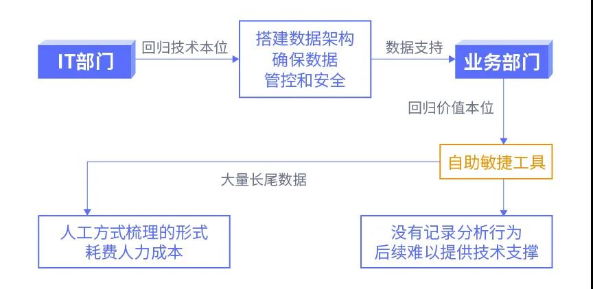到了21世紀(jì),以有一定IT能力的業(yè)務(wù)人員為中心的自助式數(shù)據(jù)分析平臺開始盛行,二代敏捷BI的熱潮襲來,在這段時間里BI廠商也如雨后春筍般涌現(xiàn),并競相大力發(fā)展可自助式分析的BI產(chǎn)品。雖然敏捷BI的出現(xiàn)一定程度上解決了部門協(xié)同的問題,但是敏捷BI對于長尾數(shù)據(jù)難以有效處理,同時分析經(jīng)驗和知識體系難以進行沉淀,IT部門很難在后續(xù)為其提供技術(shù)支撐,使其也有一定的局限性。