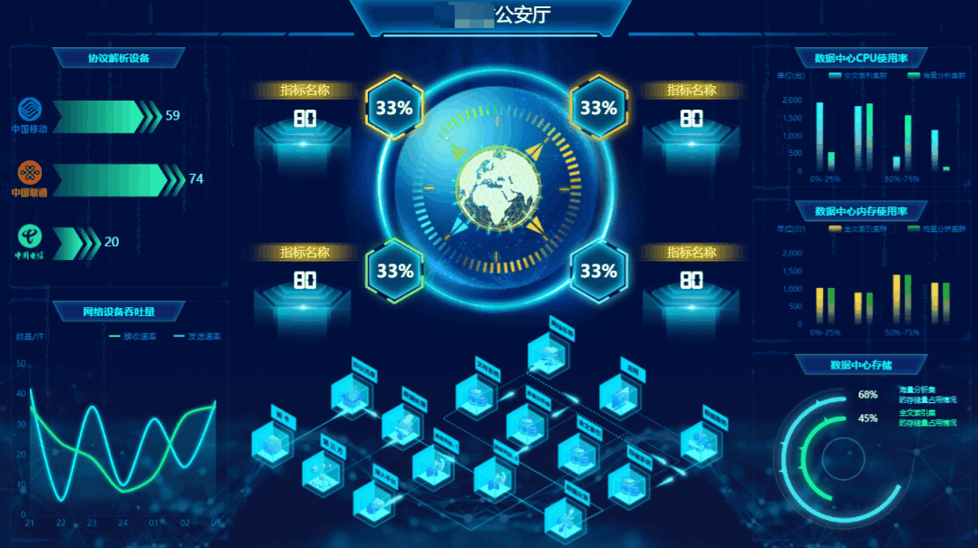 04 大屏可視化組件--輔助圖表 輔助圖表通常圍繞視覺中心的四周,起到錦上添花的作用,用來呈現(xiàn)次要指標(biāo),從各種維度進一步細(xì)化核心指標(biāo)。 不需要設(shè)置任何數(shù)據(jù),實時顯示的當(dāng)下時間,并且以時鐘表盤的方式,古典有韻味。 05 大屏可視化組件--溫度計條形圖 條形圖是用寬度相同的條形的高度或長短來表示數(shù)據(jù)多少的圖形。借用溫度計的形象,生動展示數(shù)據(jù)占比的情況。 06 大屏可視化組件--3D網(wǎng)格線地球 有了這些組件,還怕做不出酷炫的大屏嗎?億信ABI值得擁有。 我們只需要在酷屏設(shè)計器拖拽組件即可實現(xiàn),組件上的文本、數(shù)值全部支持界面化修改,方便我們快速轉(zhuǎn)化業(yè)務(wù)含義。